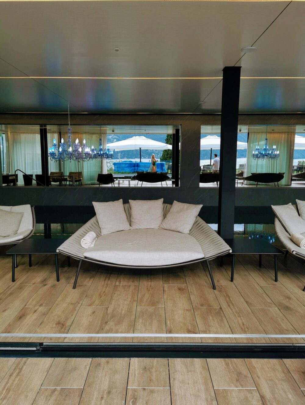You can enjoy the same breathtaking views from the modern Spa installation on the roof. It’s an ideal place to read a book, have some snacks from the serviced bar menu, watch the sunset, or work in a quiet relaxed environment with views over Lake Lugano. Using this place as my Lugano office when I am in the area for a ‚work-relaxation staycation‘, sounds ideal. If you follow my Instagram stories, you may know that I travel a lot and take my computer anywhere. My favourite places to catch up on my duties have in fact gorgeous views and huggy lounge chairs. Sun beds from where I can write emails or make calls wearing a bikini and sip on a Mojito aren’t bad either. Definitely much better than sitting in an office.